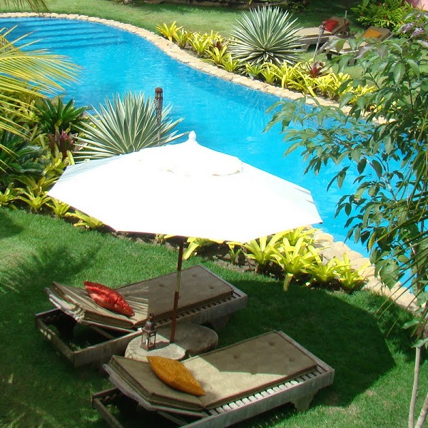 Sobre o hotel: Possui jardim tropical, área de estar, piscina com deck ao redor, lagos com carpas, quiosque com redes e almofadas, o convidam para relaxar, café da manhã, apartamentos distribuidos pelo jardim, acomodações para até 4 pessoas, ar condicionado, frigobar, Wi-fi gratuito.